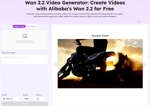 EaseMate Wan 2.2 video generator is a user-friendly web platform that provides direct, free access to the Wan 2.2 model through an intuitive interface.